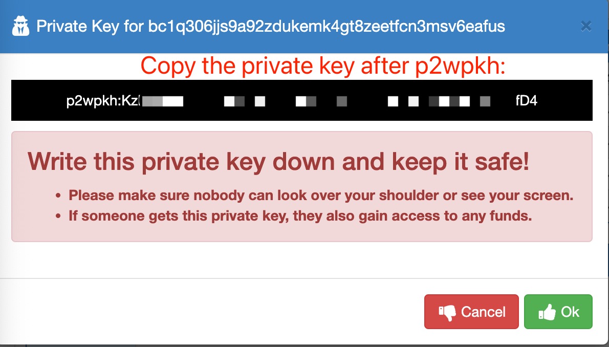 **Copy the private key after "p2wpkh:" for native segwit address which starts with 'bc1q'**